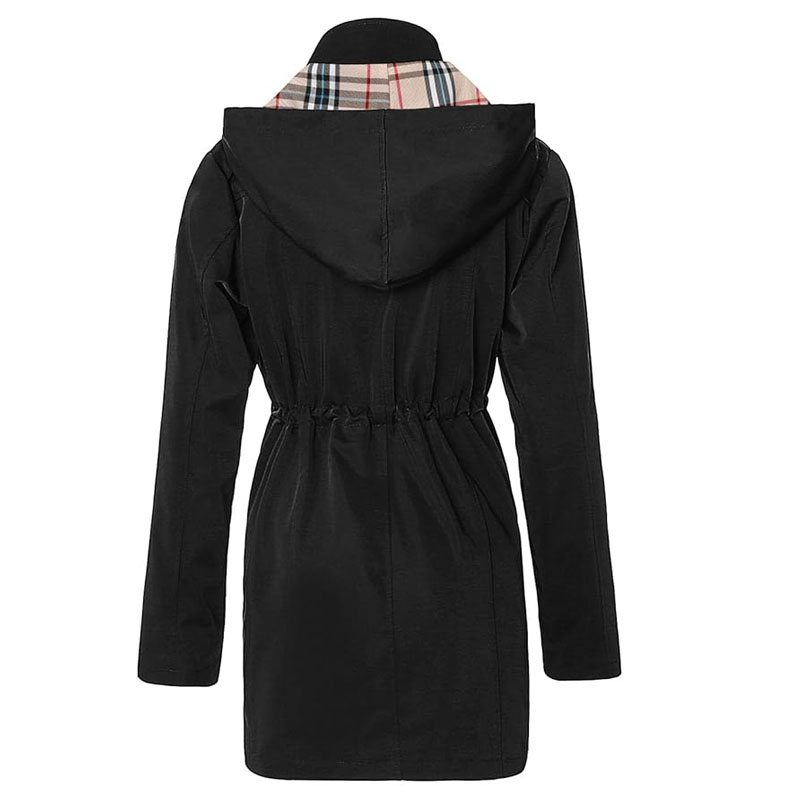 Featuring a classic belted silhouette, adjustable cuffs, and a detachable hood, this fashion rain jacket offers both style and practicality. Its knee-length cut provides full coverage while maintaining a sleek, modern look.