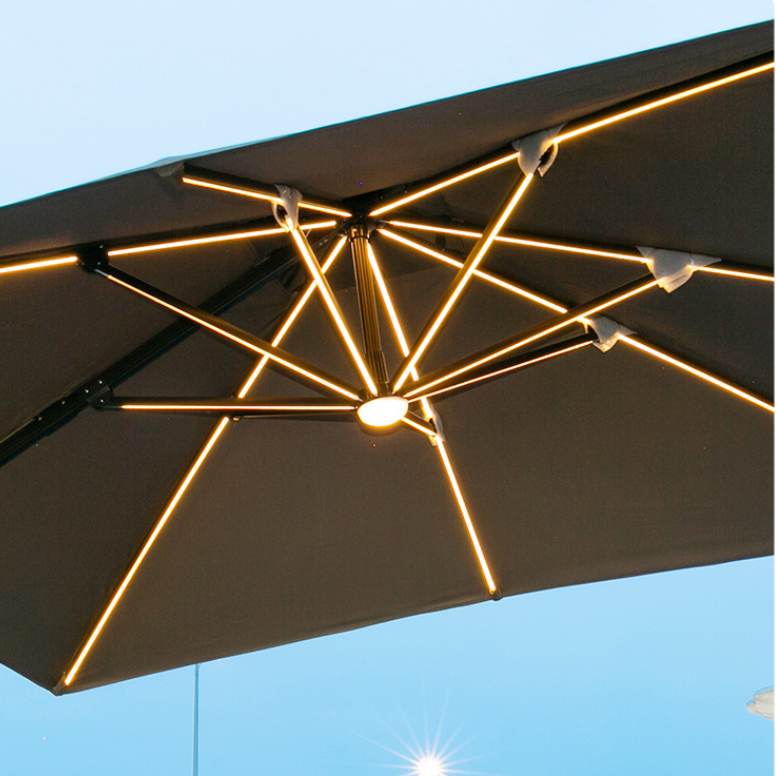 | Fabric Material | 260gsm 280t yarn-dyed fabric+Waterproof treatment + UV-cut treatment(Polyurethane.polythene,Polyolefin Elastomer(POE),Polyester、 Nylon、Pongee、 RPET、T/C、PVC are all are all available) | Ribs | With LED lights/Die-cast aluminum umbrella base + thick-walled aluminum alloy (frame) (also can customize carbon fiber or other materials) |