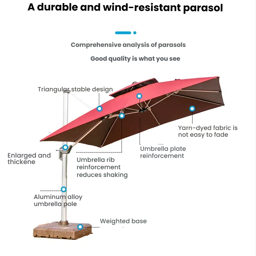 Engineered for superior performance in any setting, our premium patio umbrella is the ultimate heavy-duty shade solution for both bustling commercial spaces and private residential retreats. Designed as a true all-weather outdoor umbrella, it provides maximum sun protection and reliable wind and rain resistance for gardens, patios, restaurant terraces, cafe seating, hotel pools, villa courtyards, and residential balconies.