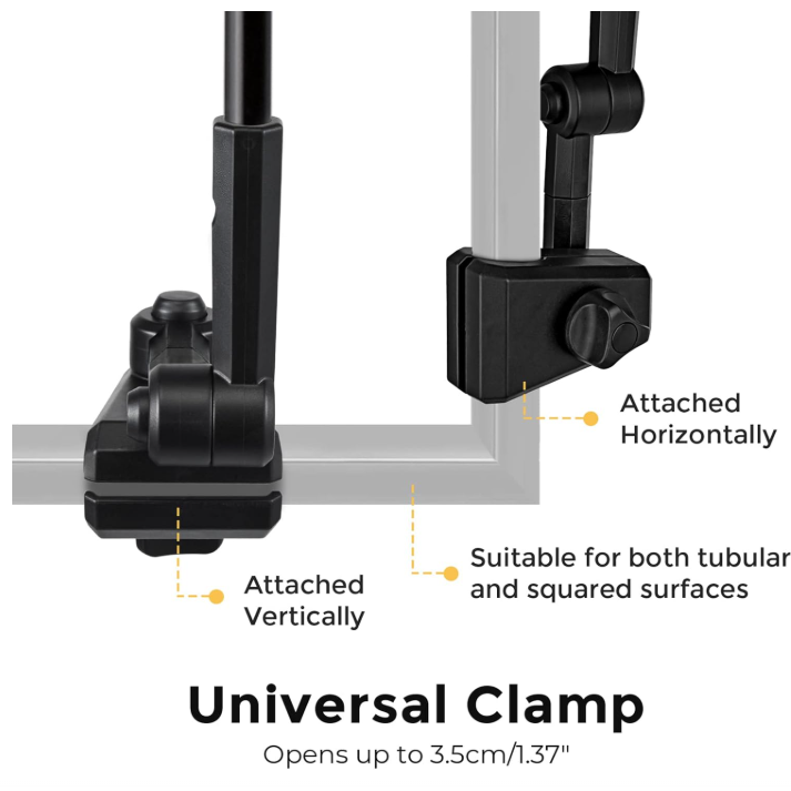 Clamp: 360° adjustable, fits surfaces up to 1.37" thick