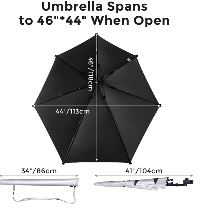 Enjoy 30% more shade than standard clamp umbrellas with a generous 46" x 44" canopy. Despite its wide coverage, it remains highly lightweight and portable, weighing just 2 lbs and folding down to 41 inches. The included carrying case makes it easy to transport and store—a truly compact travel umbrella for on-the-go protection.